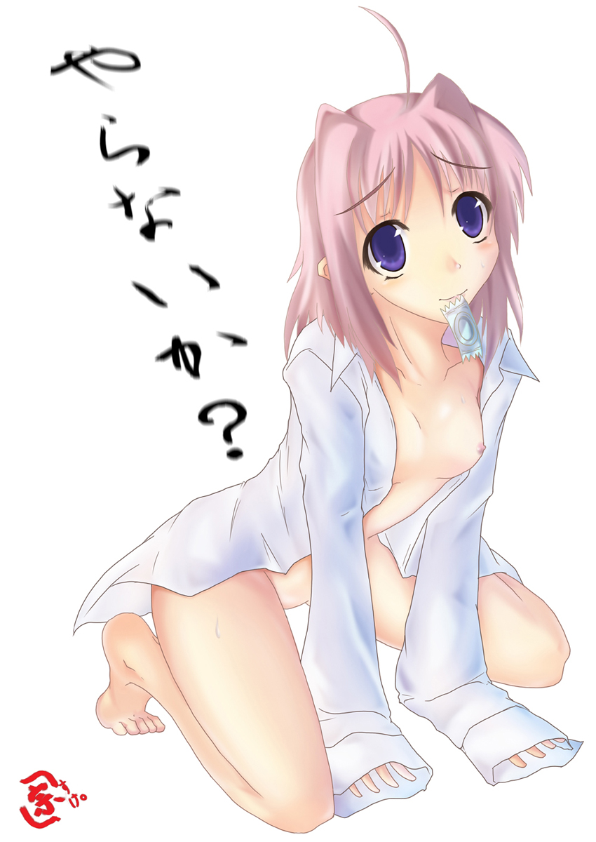 【キャロが、Yシャツ(ボタンとめてない)+パンツdeで、ベッドの上で女の子座りで、ちょっと上目遣いに恥ずかしげな表情でコンドーム(未開封)を口にくわえている。】