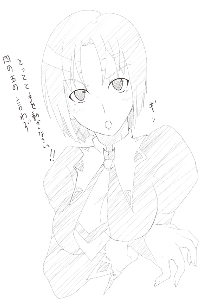 何だかんだ脳内で一時間ほど格闘して、よくやく形になっていた頃には三度目のタイトルコールが流れていたと; 生天目さんは毎回こんなことをしているのか、と感心したりしなかったり。さらに30分ほど描いていると、いつの間にか卑猥な絵に…きっと依頼主が卑猥だからだな(マテ まぁ、おっぱいポロリくらいエロくもなんとも無いか(ぇ ようじょの塗りに日々勤しんでいるこてつ☆君に比べたら僕なんて、ちょいエロですね。結局、出来上がったものの…誰よ?みたいな絵になってしまいましたと。そしてオチも無しと(ぇ-